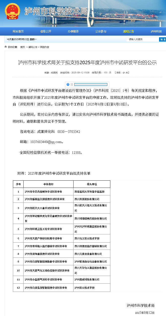 近日,泸州市科技局正式公示2025年度中试研发平台认定名单,我校申报的白酒生态智能酿造中试研发平台成功入选。