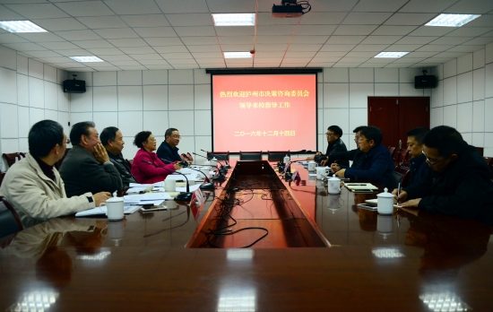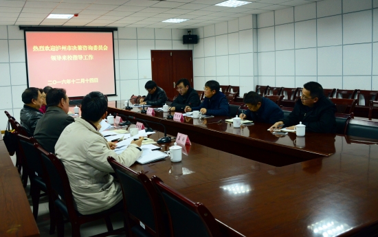 本站讯(信息来源:党政办)12月14日,泸州市决策咨询委员会主任林海云一行来到我院,听取学院领导关于“十三五”的发展规划工作的汇报,并提出指导性意见。市决咨委副主任李小端、万举修,副秘书长陈卫东、王利,学院副院长彭涛,学院党政办主任卢世伦,学院宣传部部长熊剑参加了会议。会议由学院院长贺元成教授主持。