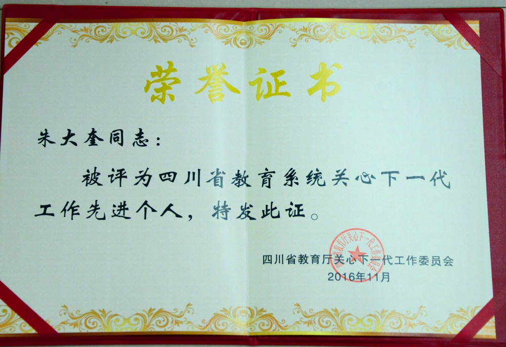 四川省教育厅关心下一代工作委员会在成立25周年前夕,表彰了一批在关心下一代工作做出了突出贡献的先进集体和个人,我院关工委委员、退休教师朱大奎被评为“四川省教育厅关心下一代工作先进个人”。