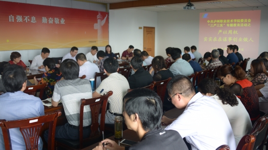 10月21日,在第二阶段党委中心组学习扩大会议上,学院党委书记代华龙领学了《关于在“三严三实”专题教育中深入贯彻落实中央八项规定、省委省政府十项规定和市委市政府十二条规定的通知》和省委组织部下发《关于在“三严三实”专题教育中认真开展南充拉票贿选案专题剖析反思的通知》,学院党委副书记、纪委书记张爽领学了省委书记王东明署名讲话文章《坚定践行“三严三实” 奋力推进“两个跨越”》,全体干部集中观看了宣传片《用生命书写忠诚--毕世祥》。