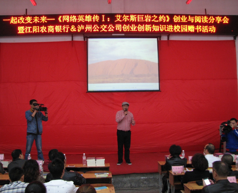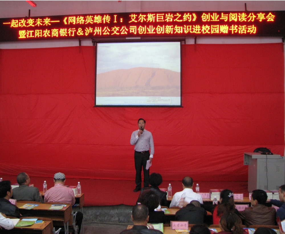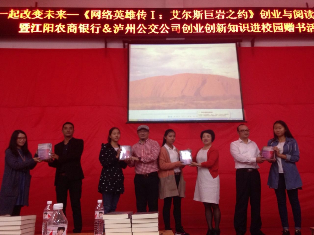 分享会上还举行了赠书活动。江阳农商银行和泸州公交公司为我院以及泸州市10所学校赠送了本次分享会主讲刘波先生创作的创业实战小说《网络英雄传I:艾尔斯巨岩之约》。