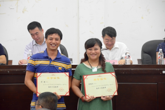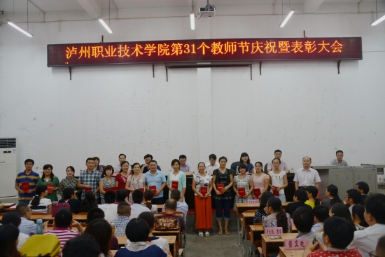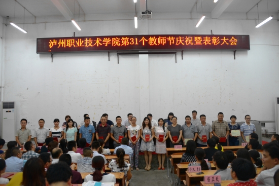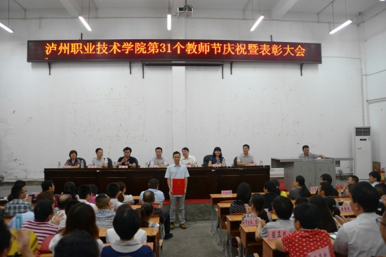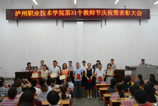 大会在庄严的国歌声中拉开帷幕。彭涛宣读了关于表彰2014-2015学年度学院优秀教师、教学十佳教师、优秀教育工作者、优秀辅导员的决定,并通报了我院商学院获得四川省教育工作先进集体称号。学院领导一一为受到表彰的同志颁奖。随后,徐波宣读了泸州市科技进步奖、泸州市社科优秀成果奖以及学院第九届学术月优秀论文的表彰决定,代华龙为获得泸州市科技进步奖的教师洪震颁奖。优秀教师代表胡丹萍同志围绕教师的职业性质,结合切身经历,作了生动而精彩的发言交流。