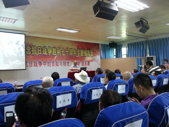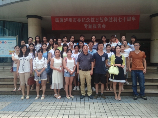本站讯(信息来源:宣传部)7月7日上午,民盟泸州市委在泸州市图书馆举办“纪念抗日战争胜利70周年专题报告会”,邀请民盟盟员、地方史学者赵永康先生作主题为《泸州人民在抗日战争中的贡献与牺牲》的专题报告,民盟万象城平台支部组织学院人文系30余名学生及盟员教师听取了专题报告。赵永康先生以大量详实的图文史料、诙谐朴实的解说语言,向大家重现了70多年前泸州人民参与修建川滇缅公路、全力支援抗日前线以及12万余人参军抗日等光辉历史,回顾了泸州人民为取得抗战胜利作出的重大贡献和牺牲,讴歌了泸州人民抗战中不屈不挠的精神。