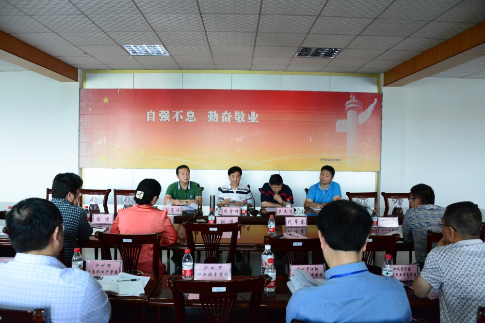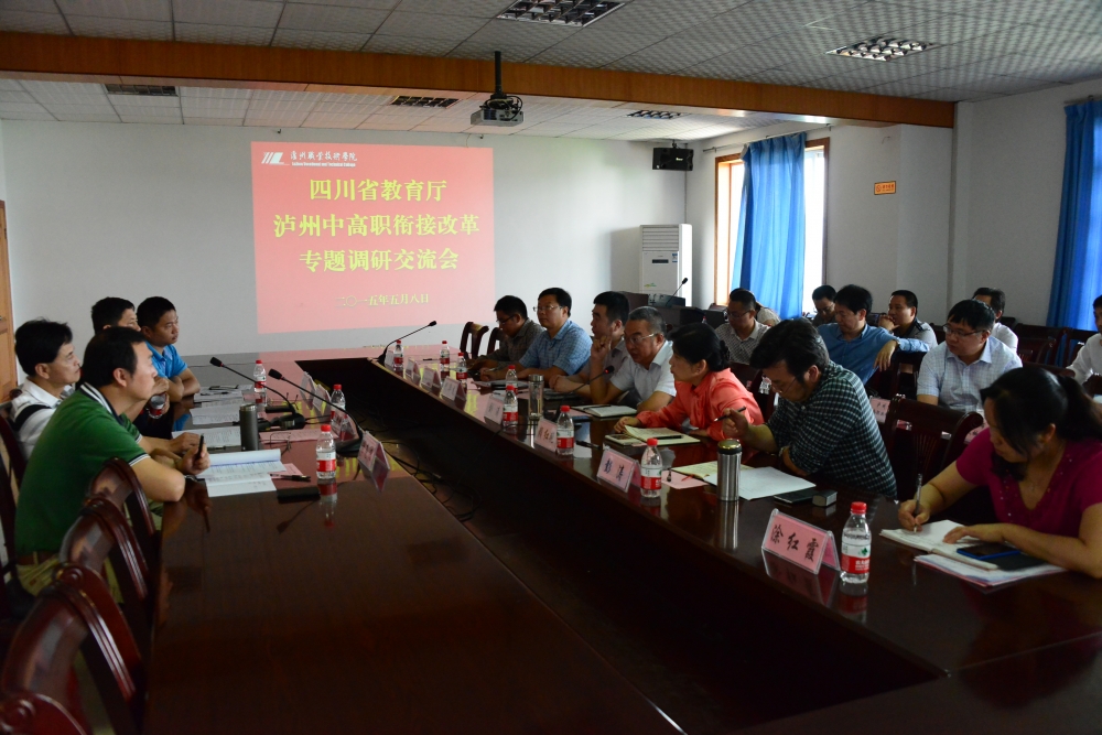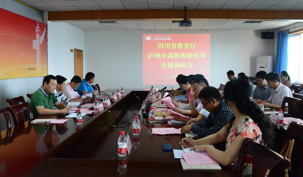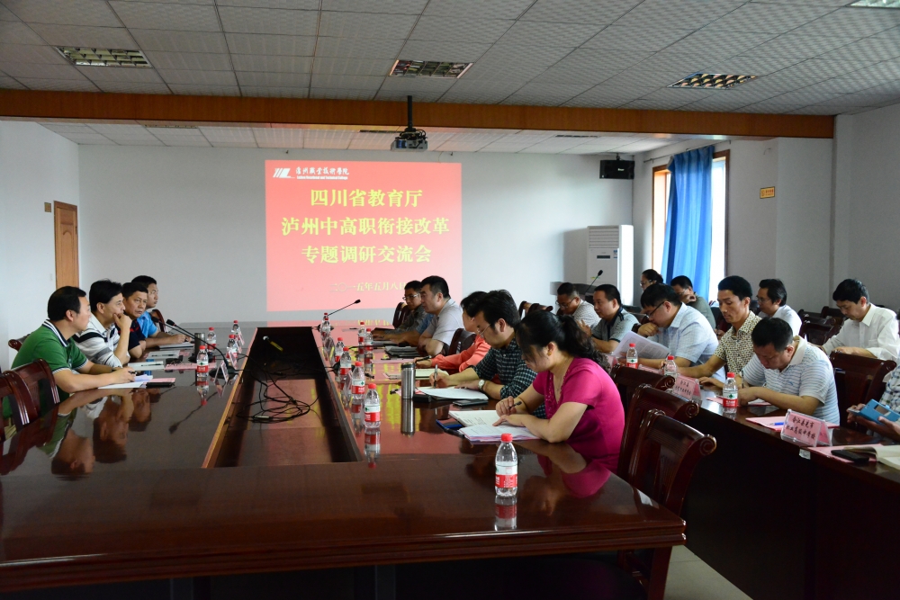 2015年5月7日至8日,四川省教育厅副巡视员周雪峰、四川省职业教育与成人教育学会秘书长罗大宪、四川省教育厅高教处副处长谢亮冯等一行4人到我院专题调研泸州市中高职一体化衔接改革工作。泸州市教育局局长刘涛、副局长赖红艳、职成教科科长涂红霞以及泸州市12所主要职业院校校长参加调研会。我院党委书记代华龙、院长贺元成、副院长彭涛以及相关部门负责同志参会。调研会分两阶段进行,第一阶段听取泸州市中高职一体化衔接工作汇报;第二阶段进行意见交流。周雪峰在意见交流会上做总结讲话。调研会由谢亮冯主持。