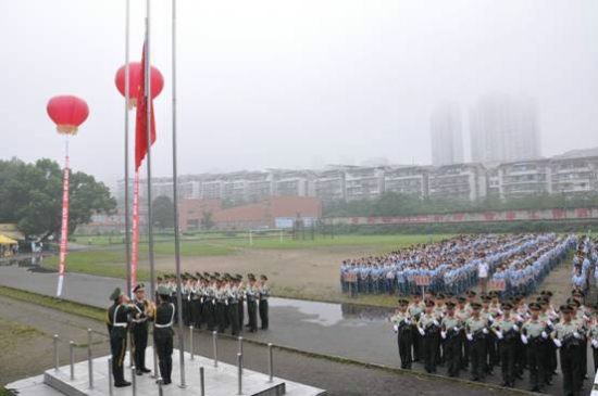 2014级新生军训开营仪式在庄严的升旗仪式中拉开帷幕。学院院长贺元成教授代表学院党政向出席仪式的武警泸州市支队领导、市作训办领导和承训部队全体教官表示热烈的欢迎和诚挚的感谢!向2014级新同学表示最热烈的欢迎!贺院长对学院的办学理念、办学思路、发展战略以及近几年来的快速发展作了相应的介绍,贺院长还提到学院顺利通过了四川省省级示范性高职院校建设验收,成功创建泸州技师学院并挂牌,被认定为四川省高技能人才培训基地。学院新校区正如火如荼地全面建设,明年新校区将投入使用。贺院长以“自强不息,勤奋敬业”的校训精神鼓舞新生,希望他们在军训中锻炼毅力、磨练意志,以饱满的热情,全身心的投入到大学生活的第一课,并将军训中学到的吃苦耐劳,勤奋锻炼的精神贯彻到今后的大学生活中