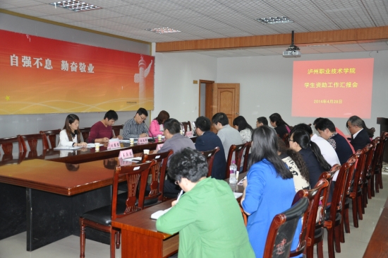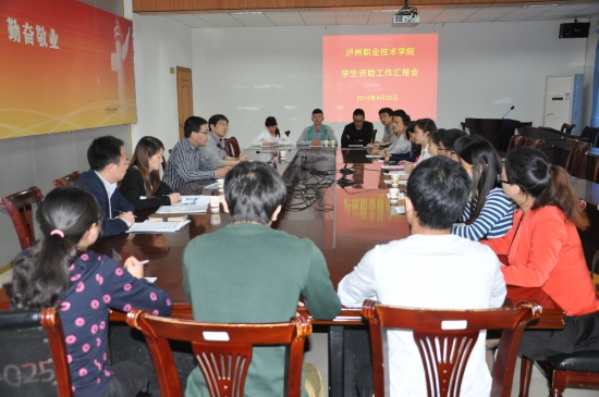 本站讯(信息来源:学生处) 4月28日下午,受省教育厅学生资助管理中心委派,泸州市学生资助管理中心主任杨郁一行四人组成工作组来我院检查指导2013年学生资助工作。学院在六会议室召开学生资助工作检查汇报会,详细汇报我院学生资助工作情况。学院党委副书记、资助工作领导小组组长张爽出席汇报会,学生处、计财处、教务处、监审处负责人及各院系党总支副书记(支部书记)和团总支书记参加汇报会。汇报会由学生处处长唐家州主持。