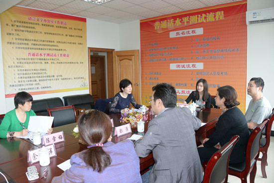 检查组一行在彭涛副院长的陪同下,首先考察了学院外语系语音实训室,并就学院下半年将要开展的计算机辅助普通话水平测试工作进行了交流指导,认为学院的“机测”条件已经具备,可以启动并实施该项工作。调研检查组还查阅了我院历年普通话水平测试工作资料,并与学院负责语言文字工作的相关负责人和测试员进行了座谈。