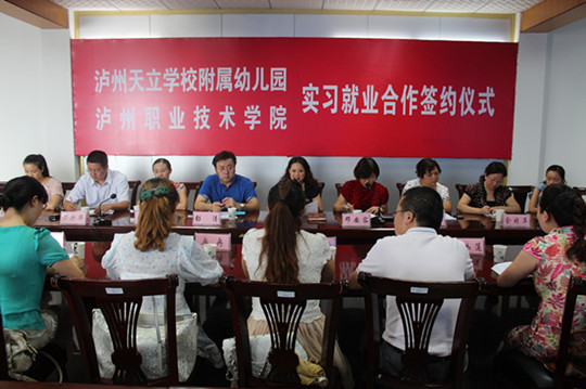 本站讯(信息来源:人文系) 8月23日上午10:30,学院在六楼会议室举行与泸州天立学校附属幼儿园实习就业合作签约仪式。学院副院长邓安容、副院长彭涛和教务处处长潘绿萍、招生就业处处长洪兴华出席签约仪式,泸州天立学校附属幼儿园园长王晓艳及其管理团队一行11人和人文系学前教育专业团队教师参加仪式,邓安容副院长主持仪式。