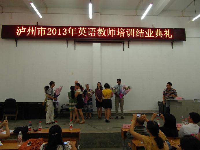 7月19日上午,由我院承办的泸州市2013年农村初中英语教师口语培训班结业典礼在学院萧秋厅隆重举行。泸州市教育局纪委书记刘林、泸州市教育局师培科科长袁媛、承担此次培训的外籍教师Amy 、Lindsay 、Jackie 、Dan 、Aaron,,以及参训的100多名农村初中英语老师和学院相关部门出席了结业典礼。