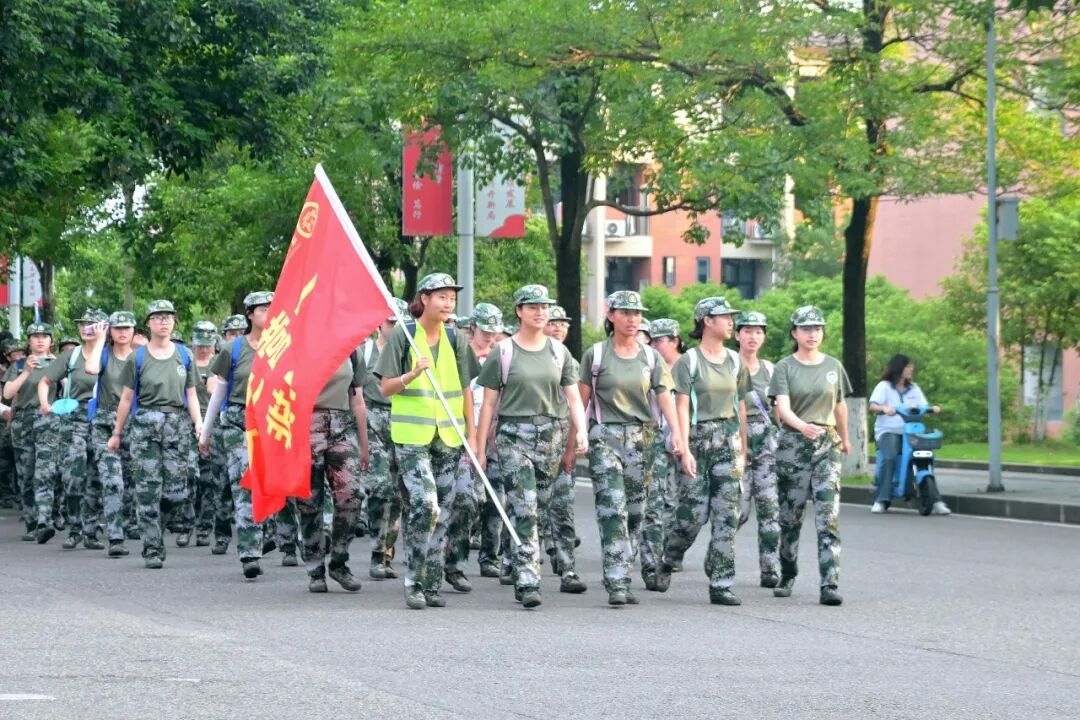 当晚18时整,参训新生们在教官和辅导员的带领下,于东华校区足球场准时集结。党委书记何杰铿锵有力地宣布:“出发”!队伍如一条威武的迷彩长龙,迎着晚风,昂首阔步走出校门,开始了这场意志与体力的考验。