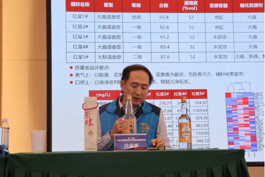 在品评环节,康大师先从风味物质构成入手,强调清香型白酒以乙酸乙酯为主体香气,整体呈现 “清香纯正、醇甜柔和、自然协调、余味净爽”的典型特征,并针对汾酒、红星两大经典品牌,详解品评要点。